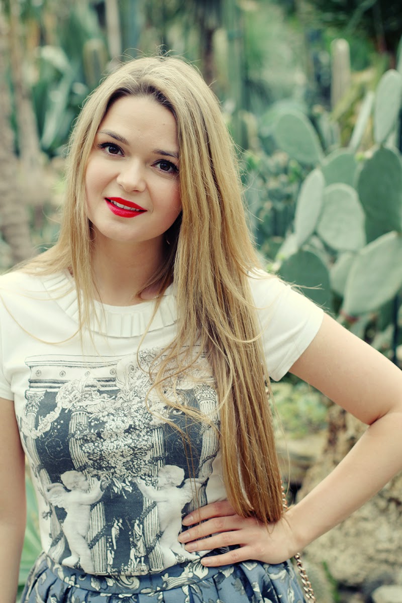 В этот раз в своем образе мне захотелось смешать нежные женственные мотивы (цветочный принт и барокко) с чем-то более жестким - кожаной курткой-косухой и грубыми ботинками. Я люблю играть на контрастах, пробовать новые сочетания. Не люблю, когда все подобрано слишком тщательно, рафинированно и прилизано. Отдаю предпочтение легкой небрежности.